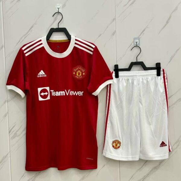 The Manchester United home kit in the image is from the 2021-22 season. It features the club’s traditional red color with a clean and simple design. The Adidas logo appears in white on the right chest, while the Manchester United club crest is on the left. The primary sponsor, “TeamViewer,” is displayed in white across the front.