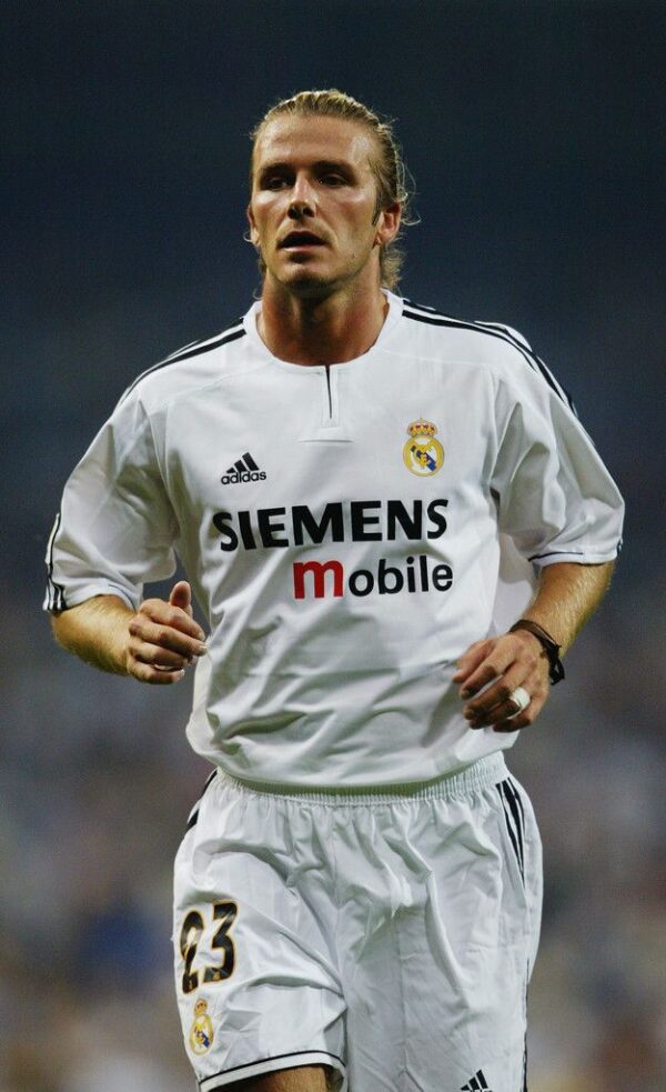 Real Madrid’s 2003 Retro Home Jersey features a sleek white design with subtle black details, representing the Galácticos era during their dominance in European football. Retro Jersey 2003.